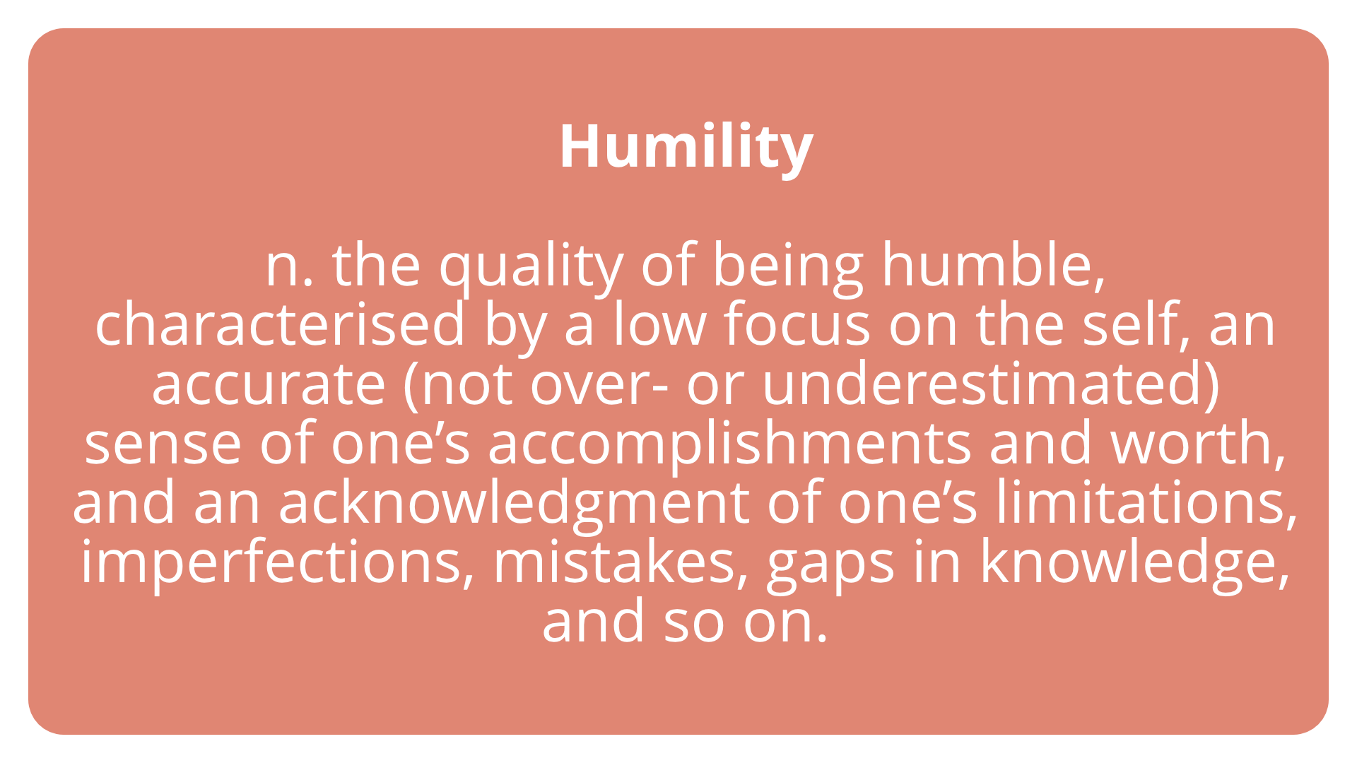 Humility: n. the quality of being humble, characterised by a low focus on the self, an accurate (not over- or underestimated) sense of one’s accomplishments and worth, and an acknowledgment of one’s limitations, imperfections, mistakes, gaps in knowledge, and so on. (APA Dictionary of Psychology, n.d.)